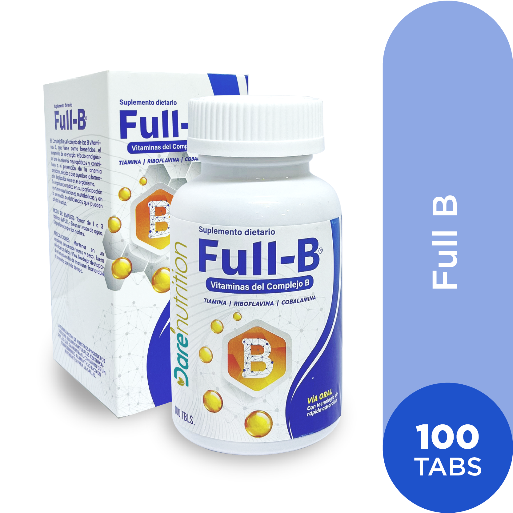 Full B, el complejo B es esencial para mejorar la energía y el estado de ánimo. Con vitaminas B1, B2, B3, B5, B6, B7, B9, B12,