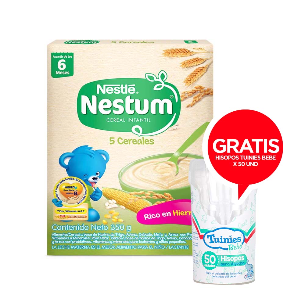 Nestum 5 Cereales 350g es un alimento infantil altamente nutritivo, elaborado con una mezcla equilibrada de trigo, maíz, avena, arroz y cebada. Su fórmula está enriquecida con vitaminas y minerales esenciales que apoyan el crecimiento y desarrollo del bebé, además de ser fácil de digerir y preparar.